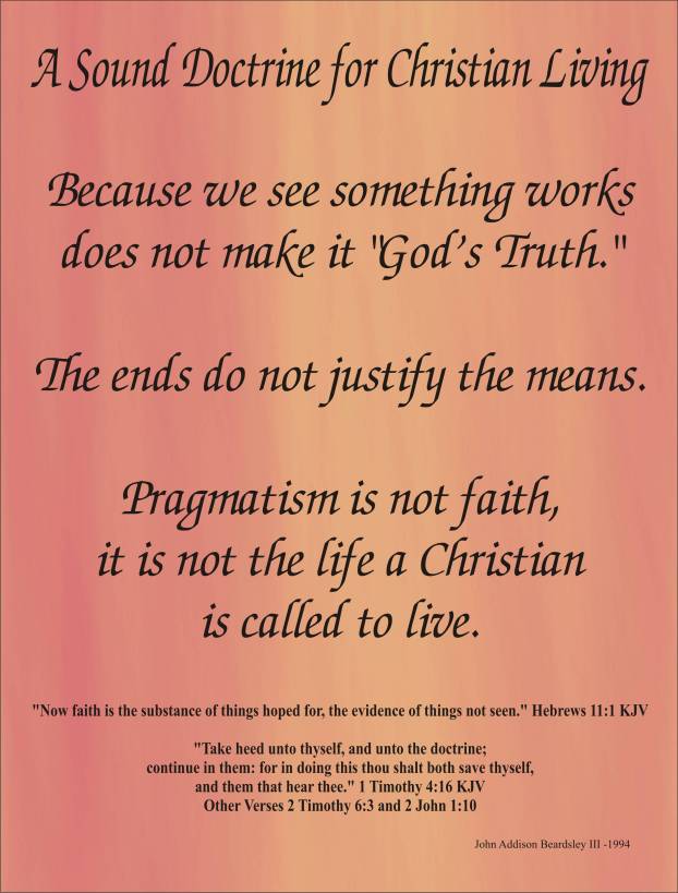 Pragmatism today often teaches all truth is God’s truth and the means often justify the ends . This is contrary to the Christian who searches their Bible to see if this thing is so. Acts 17:11, and John 5:39 Search the scriptures; for in them ye think ye have eternal life: and they are they which testify of me.